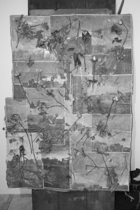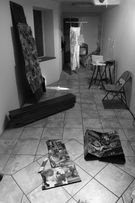 Outside, on the sidewalk, lays a floor or pieces of a floor, and some shoes.