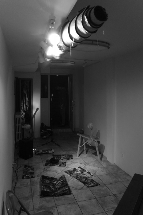 Inside the space, a small speaker is arranged for a performance. It is on the ground or propped on a bucket or box. A microphone rests on a stand near the closet.