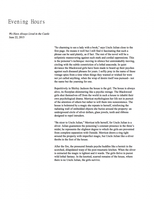 Evening Hours is pleased to present We Have Always Lived in the Castle. Join us during evening hours, Monday June 22 from 7-9pm.